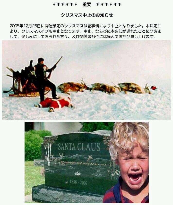※※※ クリスマス中止のお知らせ ※※※ 1 : 名無しさんといつまでも一緒 :2006/12/04(月) 12:46:37 0 残念だったね(´・ω・`). 【速報】クリスマス中止のお知らせ access_time 2008/12/19 20:37 create オサダコウジ folder ガジェ通 今北新聞 号外 「クリスマス中止決定」. クリスマス中止のお知らせ 2003年12月25日に開催予定のクリスマスは諸事情により中止になりました。 この決定により、クリスマスイブも中止ということになります。 中止、ならびにこの告知が遅れたことにつきまして、.