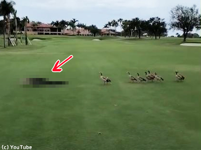 ゴルフ場でガチョウの群れを引き連れる あの生き物 にびっくり